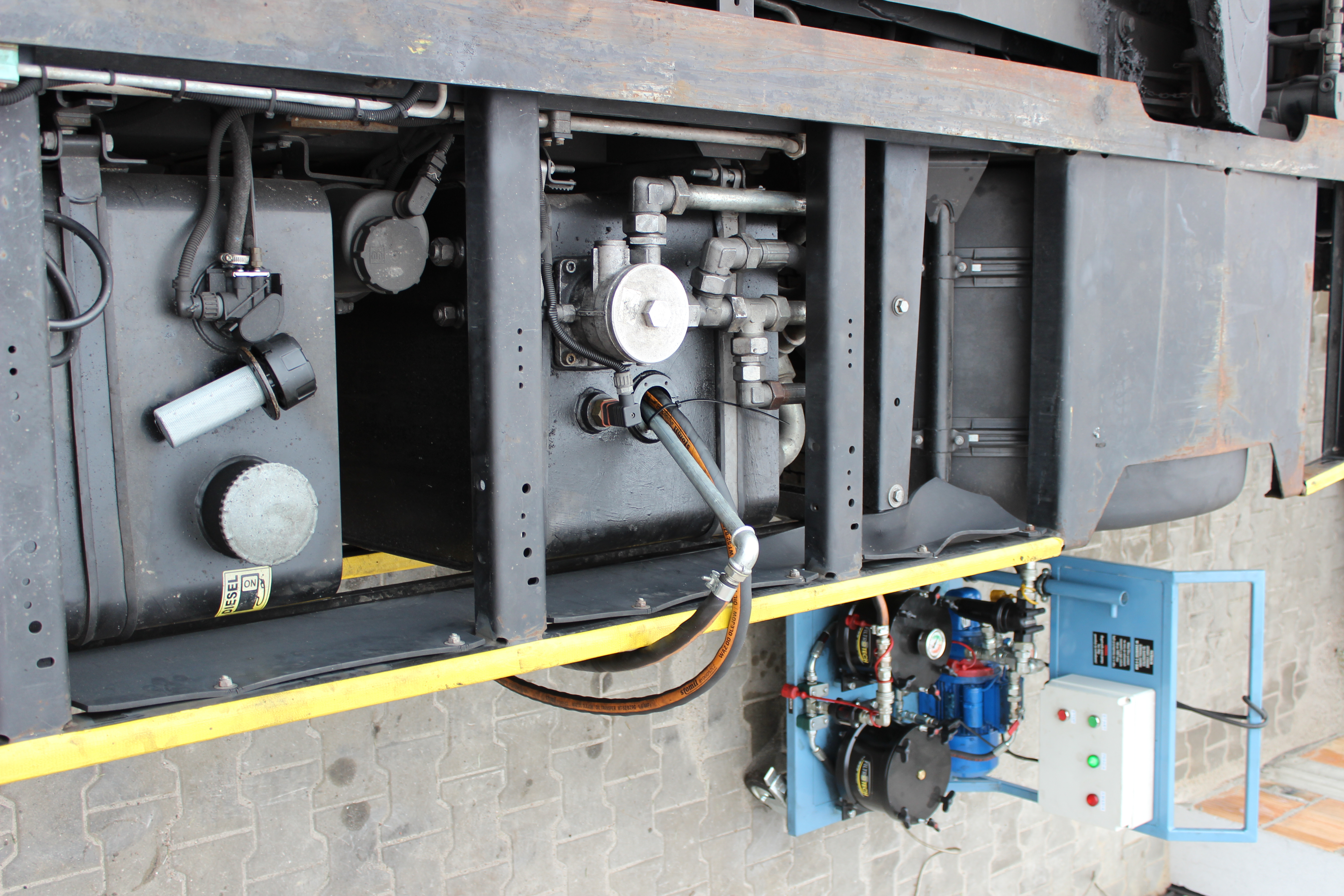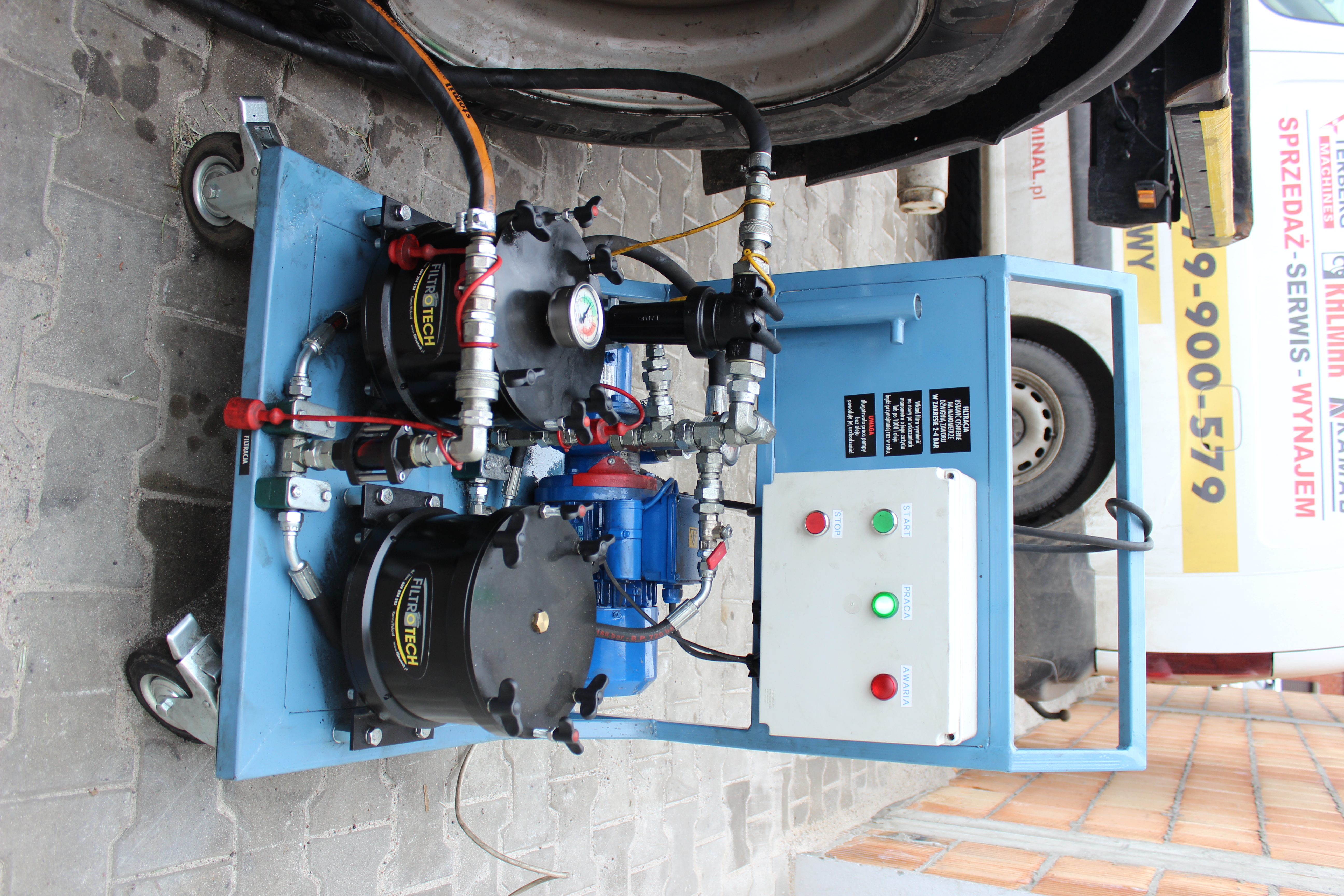 Budowa, każdego pojazdu terminalowego oparta jest na wykorzystaniu pracy systemów hydraulicznych. Poprzez zastosowanie różnego rodzaju pomp, rozdzielaczy, hydro-motorów i elektrozaworów, uzyskujemy płynne sterowanie napędem takiego pojazdu (np. Kamag) oraz sterowanie funkcjami udźwigu platformy, siedziska sprzęgu z naczepę do wspomagania kolumny kierowniczej. Zasilanie siłowników hydraulicznych olejem wymaga często uzyskania ciśnień w układzie od 200 do 450 atm. Jednym z najważniejszych elementów tej układanki jest olej hydrauliczny, od którego stanu i jakości zależy żywotność wszystkich podzespołów. Dlatego zakupiliśmy odpowiedni agregat, który pozwala nam należycie zadbać o cały układ hydrauliczny, filtrując olej wraz z wymianą filtra w układzie, eliminujemy zbędne, dodatkowe koszty które mogą powstać w razie uszkodzeń powstałych zanieczyszczeniem i złą jakością oleju.